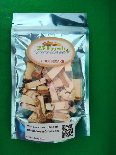 A scrumptious variety pack of cheesecake dried to crunchy perfection. Flavors include New York style, strawberry, chocolate swirl and turtle. 2.5 oz bags